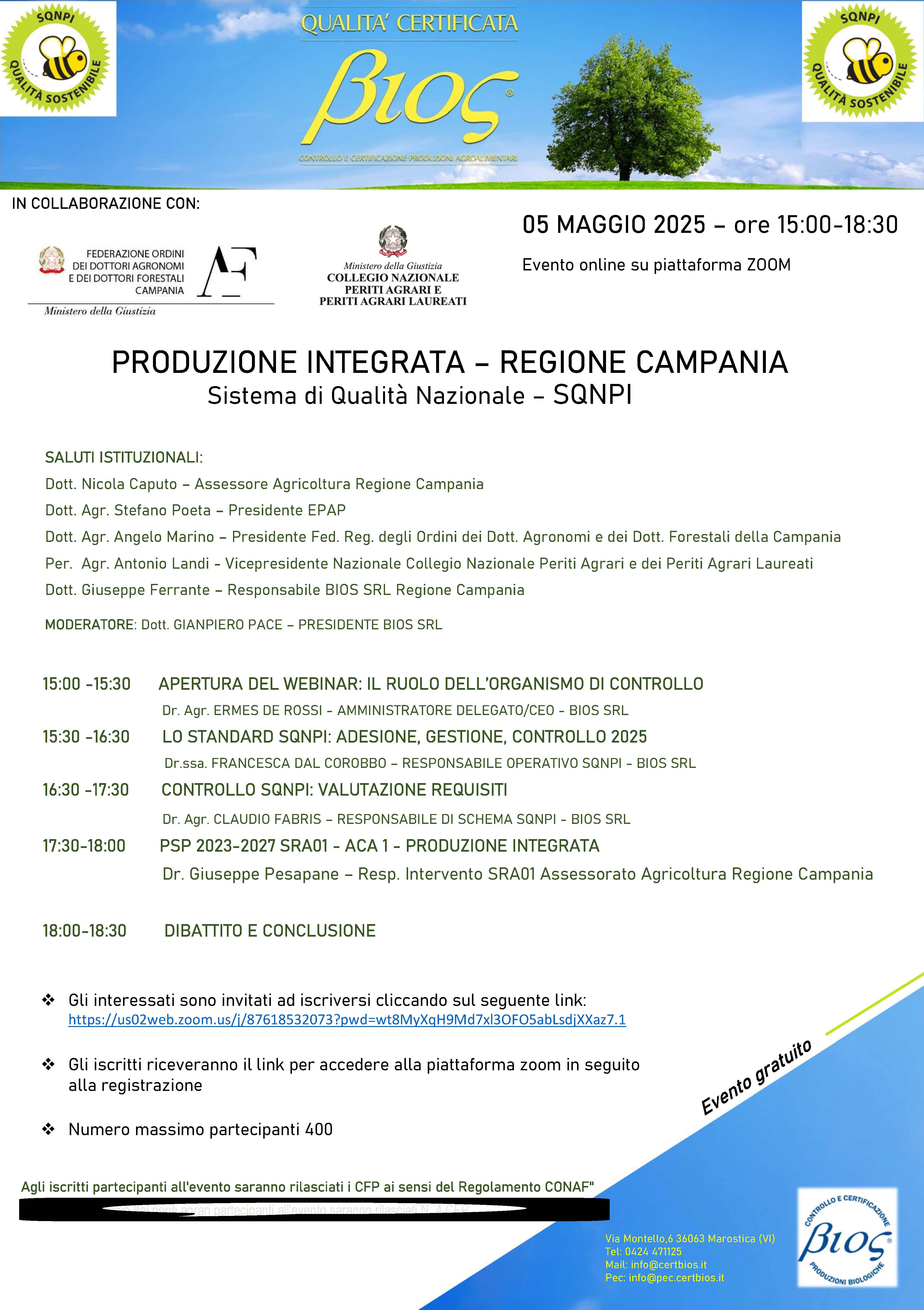PRODUZIONE INTEGRATA – REGIONE CAMPANIA Sistema di Qualità Nazionale – SQNPI 5 MAGGIO clicca qui per iscriverti! Locandina SQNPI 05.05.2025 Bios srl[1] copia Size: 1.02 MB Format: PDF Preview Creato il 30 Aprile 2025. Visite: 4622 Prec Avanti